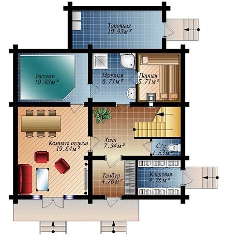 Внутреннее обустройство бани из бруса или бревна предполагает отделку пола, стен, потолка и всевозможных сидений и полок. Полы могут быть нескольких видов, в зависимости от вкусовых предпочтений и финансовых возможностей клиента. Наибольшей популярностью пользуются полы из деревянного настила - они приятны для ног, сохраняют тепло, идеально подходят для парной и предбанника. Удобными являются и бетонные полы, которые полы обычно покрывают деревянными решетками, которые легко снимаются, моются и сушатся. Классическим решением для отделки бревенчатой парной являются дощатые полы из натуральной древесины лиственных и хвойных пород. Что касается стен, то здесь представлено большое разнообразие материалов: осина, липа, кедр. В своей работе мы применяем высококачественную древесину, прошедшую термическую обработку для улучшения качества дерева и увеличения сроков его службы. Древесина для стен должна иметь низкую теплоемкость и теплопроводность, должна хорошо пахнуть и быть устойчивой к расщеплению. Чем меньше на таком дереве сучков и смоляных пятен, тем лучше. Для потолка подойдет древесина с низкой теплопроводностью и малым содержанием смолы. Как известно, горячий воздух поднимается вверх, поэтому самая высокая температура будет под потолком. Материал, которым будет обит потолок бани, не должен содержать смолу, иначе под воздействием температуры она будет плавиться и капать вниз. Кроме того, материал должен быть устойчивым к перепадам температуры и влажности. Для каждого из банных помещений должны быть подобраны оптимально подходящие материалы, обеспечивающие не только красивый внешний вид, но и длительную эксплуатацию, и сохранение теплоизолирующих свойств помещения. Облицовочная рейка является завершающим этапом отделки парилки. Принято отбирать рейки для внутренней обшивки без сучков. Связано это с тем, что сучки имеют большую плотность, чем основная древесина, и сильнее нагреваются. Прислонишься случайно к сучку - ожог обеспечен. Именно поэтому обшивочная вагонка для бани стоит так дорого. Часто рекомендуют между чистовой обшивкой и утеплителем укладывать дополнительный слой из шпунтованной доски. Применять черновой слой из шпунтованной доски древесины любых пород для утепления бани совершенно ни к чему, если применяется минеральный утеплитель и фольга, склеенная алюминиевой лентой. К тому же, попадание влаги под чистовую рейку приведет к гниению этого чернового слоя досок и, соответственно, всей конструкции. Если все же принято решение укладывать черновой слой, то между ним и декоративной обшивкой следует дополнительно проложить пароизоляционный слой из фольги. Что лучше для чистовой обшивки - липа или осина, - сказать трудно. Кому что больше нравится. Считается, что осина - это дерево, впитывающее в себя энергию, т.е. пока человек в "осиновой" бане парится, осина как бы оттягивает на себя все болезни. Липа, наоборот, считается энергетическим донором - паришься и одновременно "подзаряжаешь" организм. Ни с чем не сравним запах липы в разогретой бане! Особенно, в только что построенной. Для получения неповторимого аромата стоит прикрепить к липовой или осиновой вагонке в районе нагревателя несколько коротких досок из кедра или сосны. Нагреваясь, эти доски дают неповторимый аромат, такой, как летом в сосновом