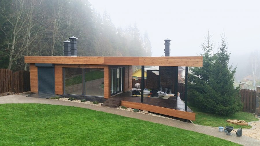 На фото представлен дом с плоской крышей "Archiline", который окрашен лессирующим атисептиком Тиккурила Валтти Колор Сатин, цвет 5056 (Лиса) и 5083 (Камень):
