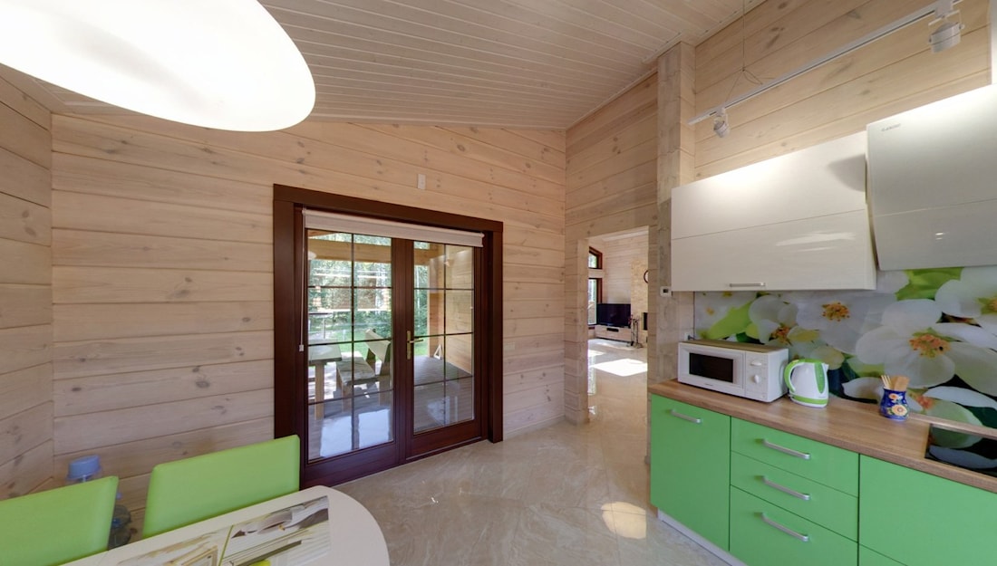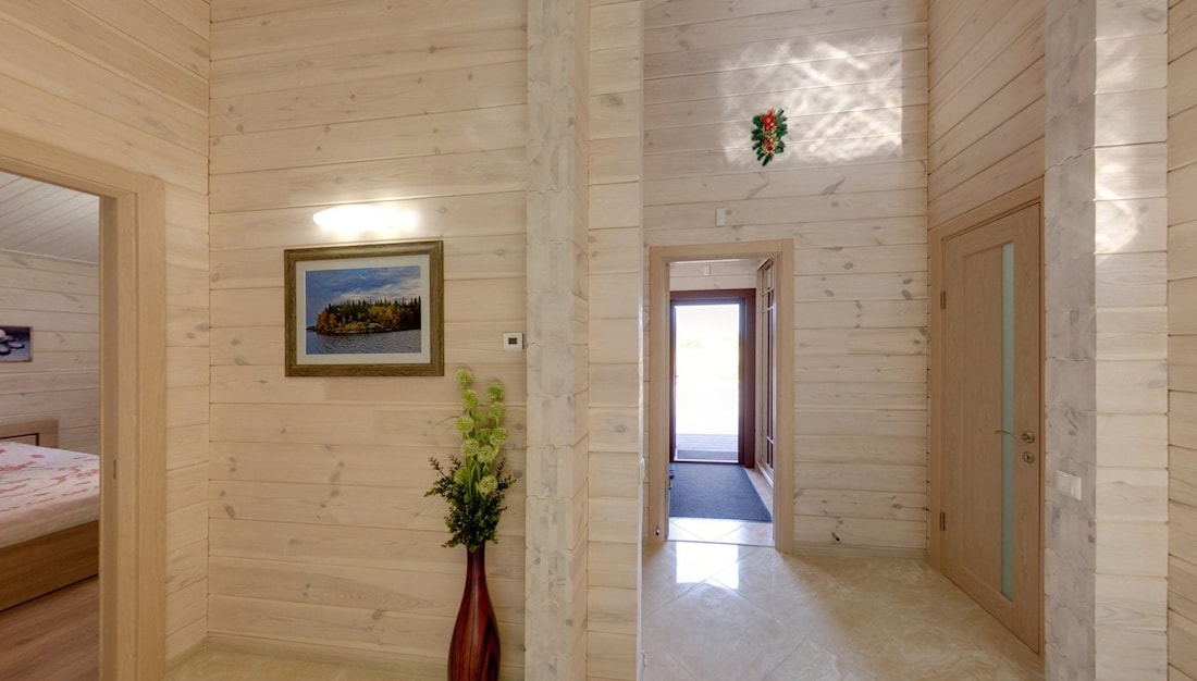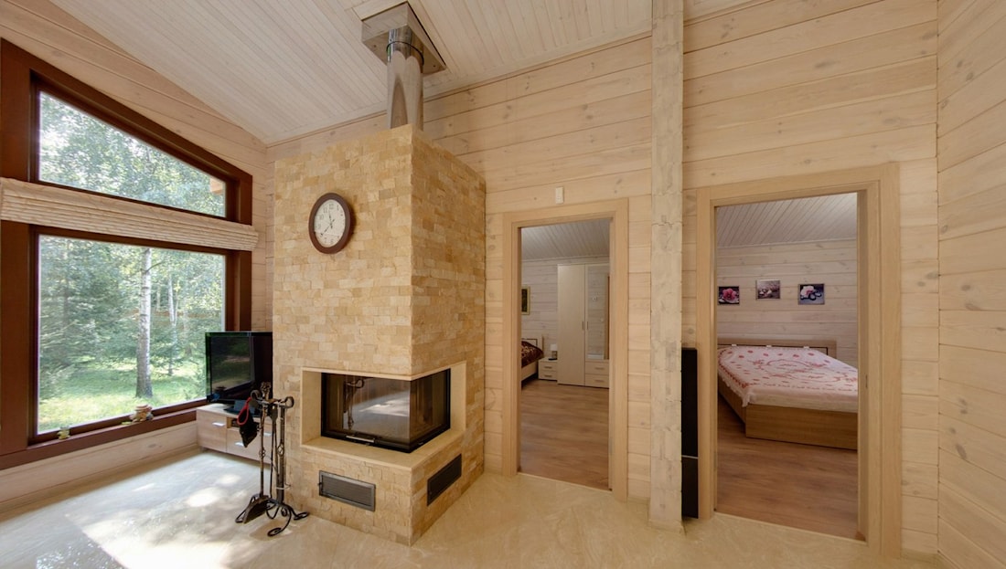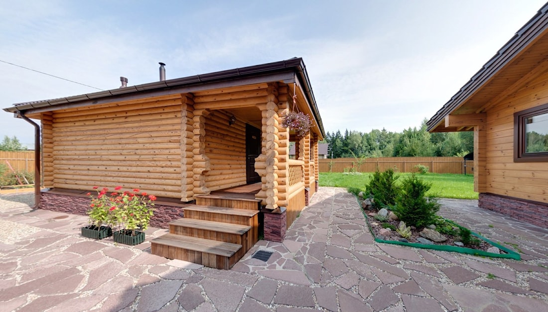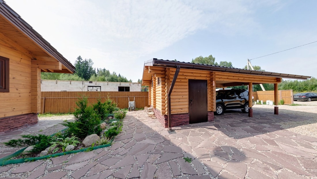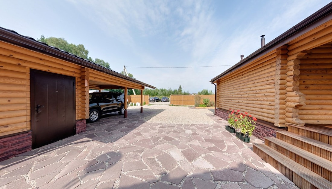 . БОЛЬШОЙ 3D-ТУР ПО ДОМУ: . . ВНЕШНИЙ ВИД: . Благодаря использованию современных материалов фасады имеют естественную фактуру дерева, что в свою очередь придает дому некую аутентичность. Материал кровли – натуральная керамическая черепица немецкого производства Roben. Лучший вариант для деревянного дома – это тяжелая черепица, для того, чтобы стены всегда были под нагрузкой, в результате чего не появится зазоров и щелей между венцами: . . ФОТОЭКСКУРСИЯ ПО ДОМУ: . "Театр начинается с вешалки", а дом - с тамбура и обязательной прихожей, где можно оставить грязную обувь и снять верхнюю одежду. Из прихожей можно сразу попасть в ванную комнату налево или в котельную направо: . Совмещенный санитарный узел: . .Несомненно, главной комнатой этого дома является просторная гостиная. На одной из стен которой прекрасно вписался камин, похожий на печь. Очаг - главный центр притяжения - хорошо просматривается из кухонной и столовой зон и создает в пространстве для отдыха атмосферу тепла и уюта, а большые окна наполняют ее естественным светом. Окна в доме деревянные, выполнены партнером нашей компании. С такими окнами будет тепло, даже если вся стена будет выполнена не в материале – в дереве, а именно в стекле: . . Из гостиной проходим в две спальные комнаты: . . . . Так же из гостиной попадаем на кухню. Проем без дверей, расширяет пространство: . . . . Прямо с кухни в теплую погоду через большую остекленную дверь выходим позавтракать на большую террасу, откуда открывается прекрасный вид на лес: . . . Отличным вариантом для организации заезда на участок являются откатные ворота: . На участке помимо самого дома дополнительно располагаются навес для автомобиля с хозяйственной постройкой и баня из оцилиндрованного бревна: . . Подробный обзор бани можно посмотреть здесь . Проект бани с комнатой отдыха "Парни" Если вас заинтересовала представленная информация или вы не нашли нужный товар или услугу, пожалуйста, позвоните или отправьте запрос на консультацию: