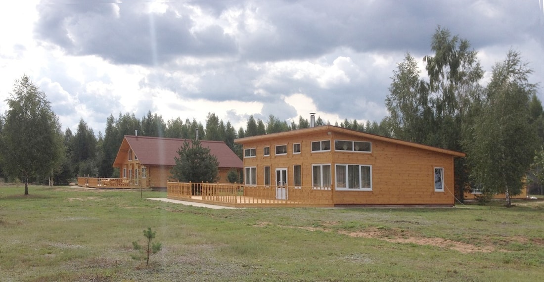Дом проект "Домостроение Беларуси" из бруса и с металлической трубой, украшающей фасад дома. В доме размещены четыре спальни, одна из них гостевая на первом этаже и три на втором этаже. Огромная гостиная комната площадью почти шестьдесят метров квадратных, две просторных террасы, внутри дома расположена веранда на которой может быть либо летняя кухня, либо небольшая оранжерея. На втором этаже из общего холла можно попасть каждую из трех спален, второй свет дополнительно освещает холл, а из самой большой спальни площадью почти в сорок метров можно выйти на балкон. В деревянном доме "Домостроение Беларуси" первый этаж предназначен для отдыха всех постояльцев, и центральное место отведено двусветной гостиной. По замыслу заказчика, интерьер должен создавать атмосферу уверенности, спокойствия и сосредоточенности - то, что нужно для жизни. По мнению заказчика даже самый самый активный отдых и спорт должны сочетаться с комфортом высшего класса. Поэтому он решил возвести комплекс, равного которому ни по масштабам, ни по качеству не будет в радиусе многих километров. "Домостроение Беларуси" соответствует этим требованиям. Основная концепция внутреннего пространства дома "Домостроение Беларуси" - сдержанный, наполненный энергией, но в то же время элегантный интерьер. Вытянутая форма участка, желание сохранить вековые деревья и дать возможность для уединения предопределили форму дома "Домостроение Беларуси" . Два дома разбивают территорию на части.
