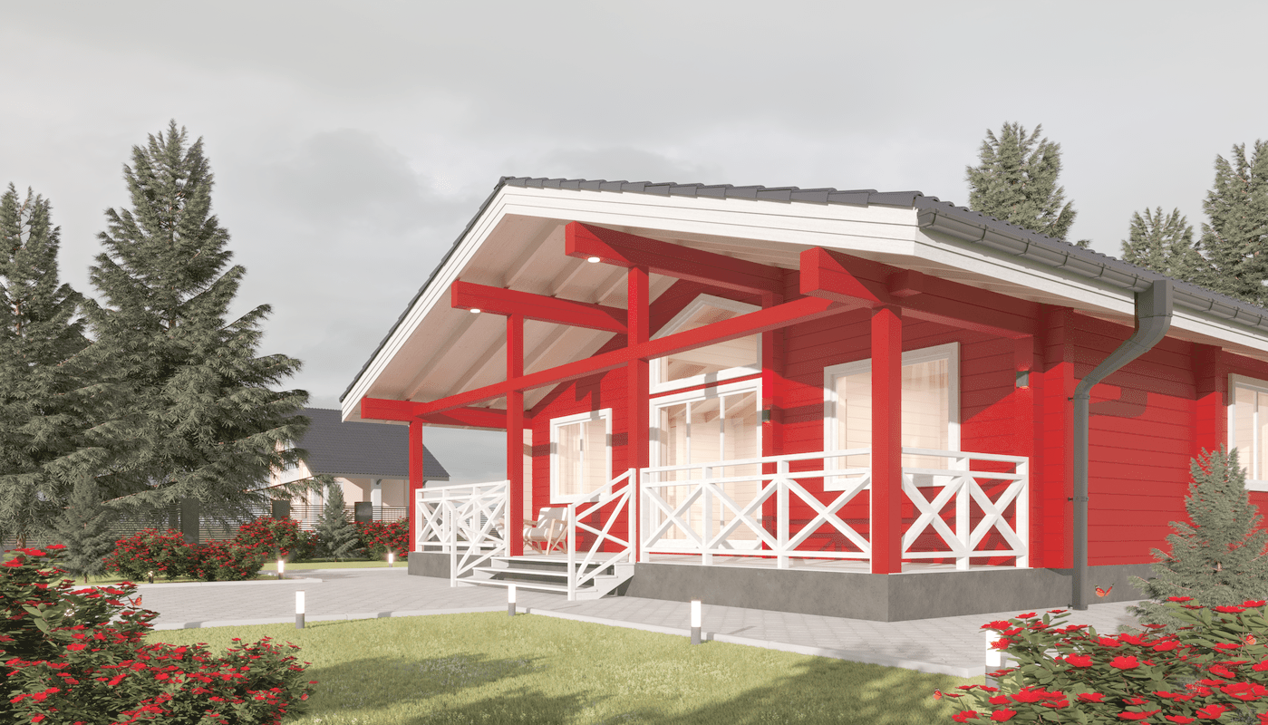 Акцентом проекта, безусловно, является яркий красный цвет наружных стен, придающий фасаду праздничный, привлекательный вид. Контраст с белыми наличниками на окнах, ограждением на террасе и крыльце и подшивкой кровли визуально успокаивает глаз, выгодно подчеркивая стены.