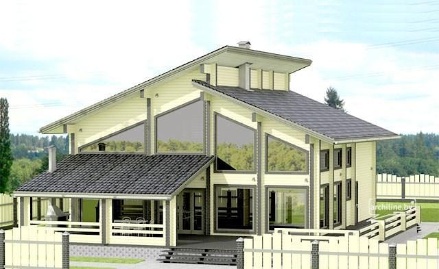 Деревянный дом в Кыргызстане, проект «Бишкек» – оригинальный проект деревянного дома из профилированного бруса, с общей площадью 214 квадратных метров. Проект предусматривает один этаж, семь комнат и сауну. Хорошим решением служит использование бруса разных тонов.